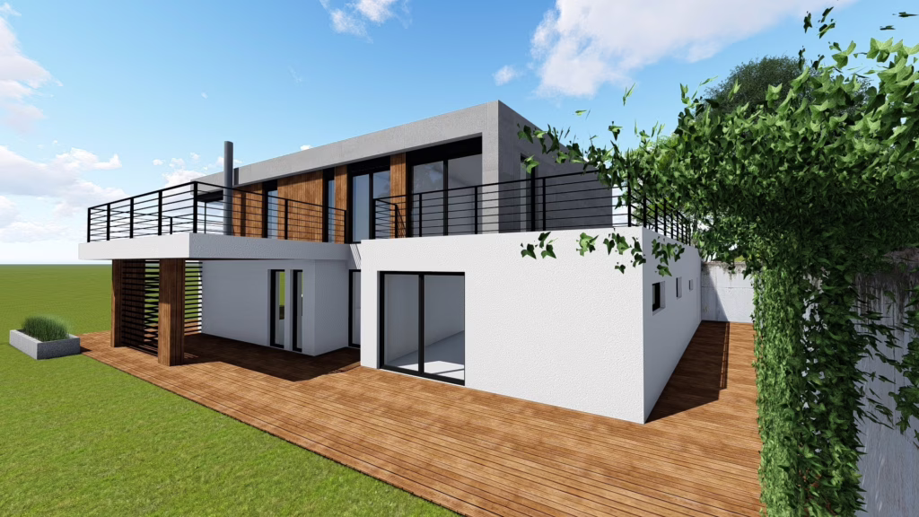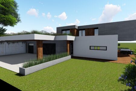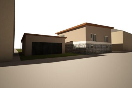 zámer: Tento tvarovo jednoduchý rodinný dom kopíruje tvar pozemku v pôdoryse dvoma kolmými a dvoma zošikmenými obvodovými stenami.