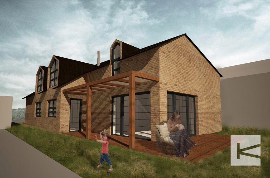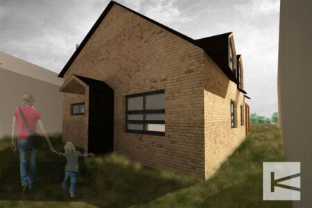 zámer: Tento tvarovo jednoduchý rodinný dom kopíruje tvar pozemku v pôdoryse dvoma kolmými a dvoma zošikmenými obvodovými stenami. Rovnaký princíp je využitý aj pri tvarovaní sedlovej strechy, ktorá sa znižuje zo severnej strany k južnej, čím sa objekt oddeľuje od prístupovej cesty. Tehlovým obkladom sa dom jedinečne prispôsobuje vidieckemu prostrediu.